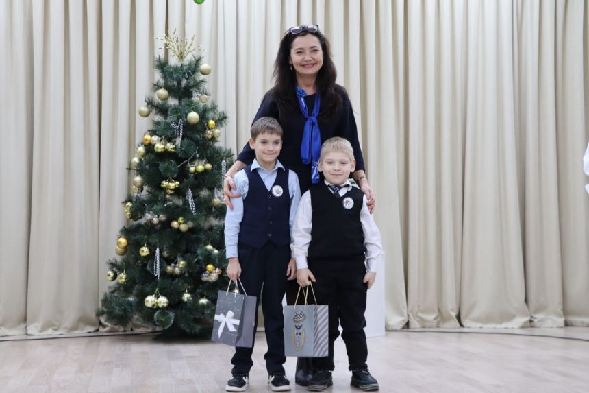 Ирина Павлюченя вручила подарки от «Белорусского союза женщин» ученикам Андрею Талаю и Никите Станиславчику.