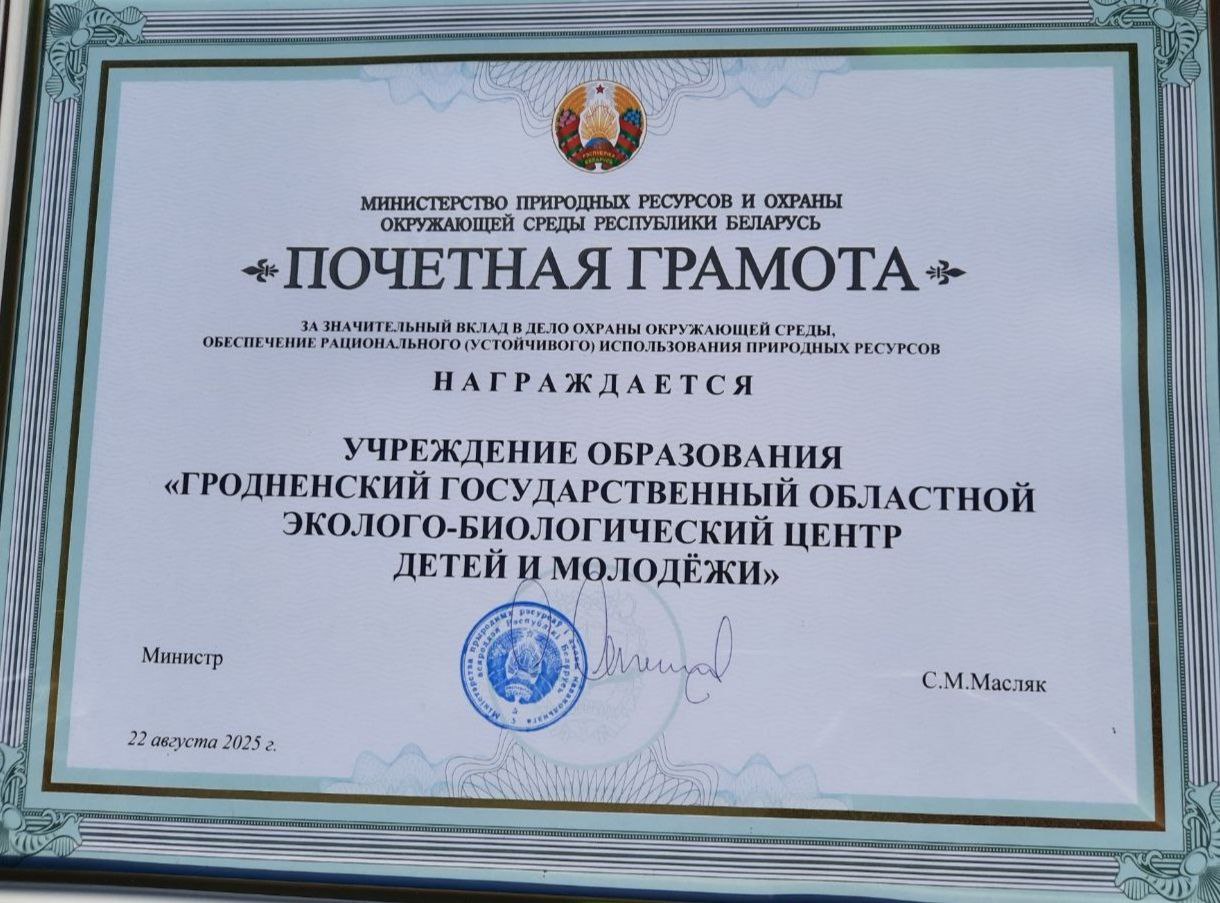 Гродненский государственный областной эколого-биологический центр на XVIII республиканском экологическом форуме награжден Почетной грамотой Министерства природных ресурсов и охраны окружающей среды Республики Беларусь.