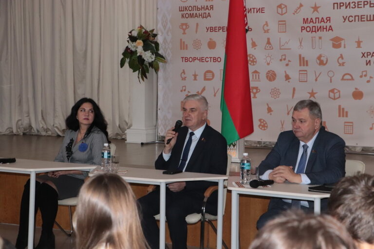 На вопросы учащихся колледжей и старшеклассников отвечали приглашенные гости. Среди них были депутат Палаты представителей Национального собрания Республики Беларусь Валентин Михайлович Семеняко, председатель районного Совета депутатов, председатель Слонимского районного отделения Белорусской партии «Белая Русь» Олег Мечиславович Таргонский и заместитель начальника отдела идеологической работы и по делам молодежи райисполкома, председатель районной организации ОО «Белорусский союз женщин» Наталья Михайловна Грасевич. Включились в беседу и слонимчанки Ангелина Анатольевна Ивуть и Дарья Андреевна Романина – девушки с активной гражданской позицией, представляющие интересы молодежи района на уровне области и республики.