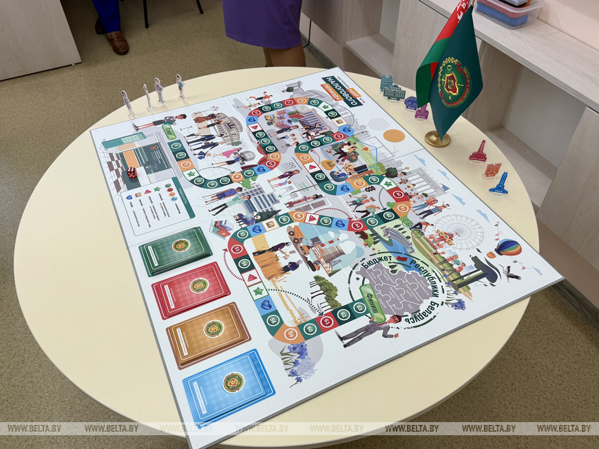 Игра состоит из игрового поля, оно стилизовано под карту Беларуси. На нем представлены пять важнейших социальных сфер, которые финансируются и содержатся за счет бюджетных средств. "Есть еще один немаловажный аспект. Мы хотели рассказать детям, на какие цели направляются налоги. Поэтому на игровом поле изображены значимые объекты Беларуси, восстановление и содержание которых осуществляется в том числе за счет средств бюджета страны. Механика игры самая простая - бросаются кубики, делается ход, потом берется карточка в зависимости от того цвета, который указан на клетке. Зеленые - сбор налогов, красные - возврат. Желтые карточки - это льготы, когда налоги не собираются и не возвращаются. Голубая карточка позволяет ребенку ознакомиться с историей объекта, восстановление которого осуществлялось в том числе за счет средств бюджета. Также важно отметить, что мы попытались соединить онлайн- и офлайн-форматы, поэтому на каждой карточке размещен QR-код: наводишь его - виртуальный инспектор рассказывает дополнительную информацию и истории о налогах", - добавил директор центра.