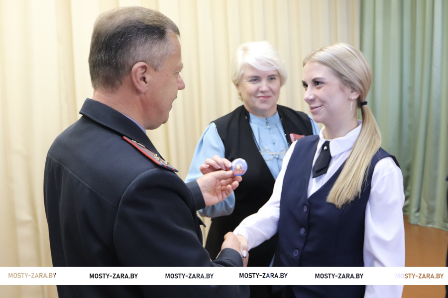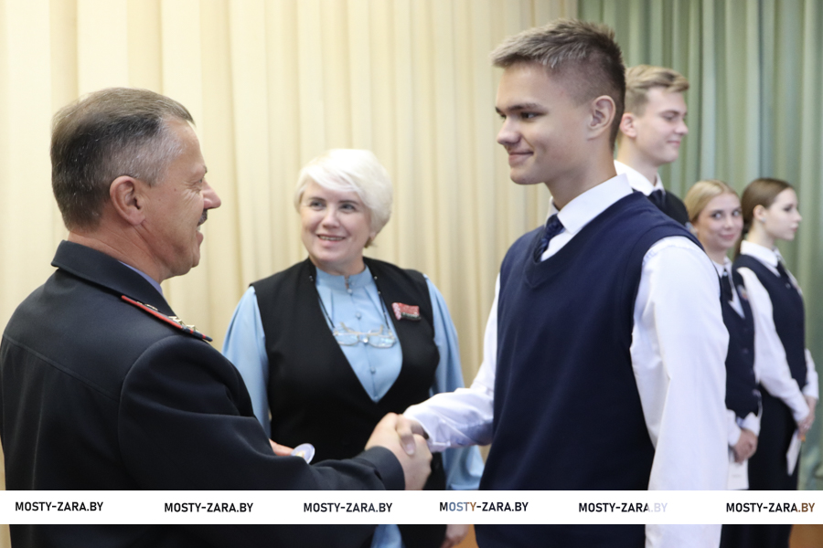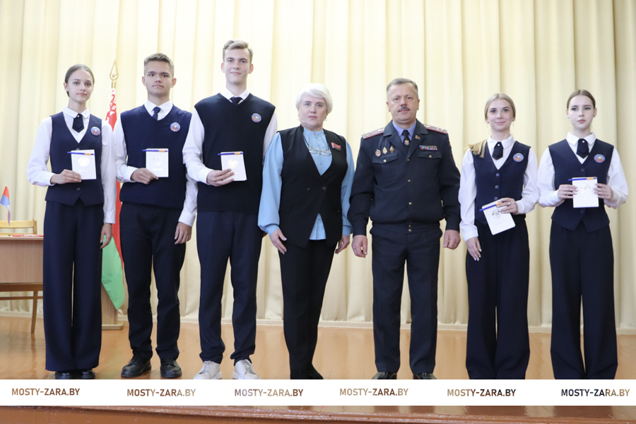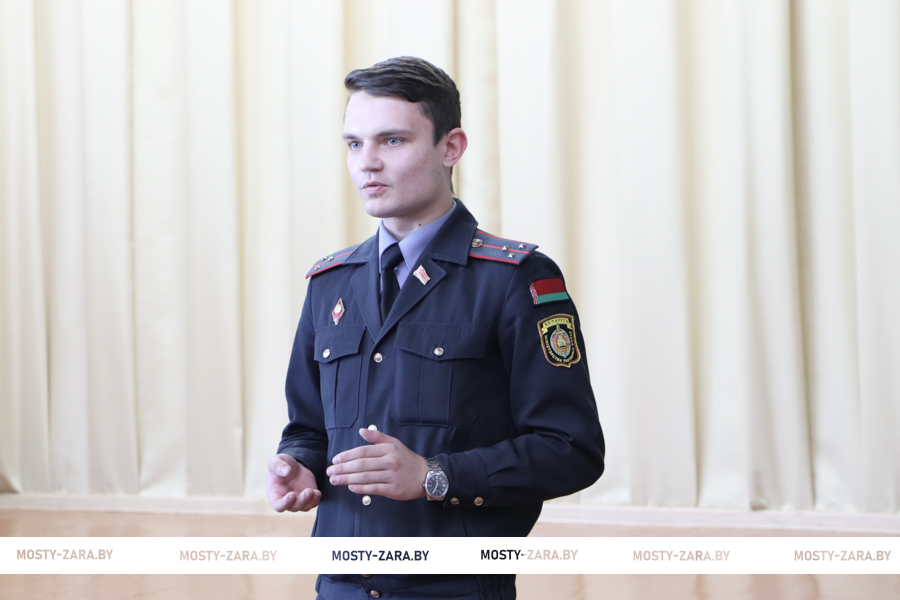 Дружными аплодисментами присутствующие приветствуют Екатерину Вангул, Александру Дубатовка, Артёма Кравцевича, Владислава Матейчика, Илью Патонича и Ксению Якимчик. Сделав выбор в пользу профессий, которые требуют высокой ответственности, самоотверженности, мужества и профессионализма, эти ребята в скором будущем станут на защиту интересов людей и государства.