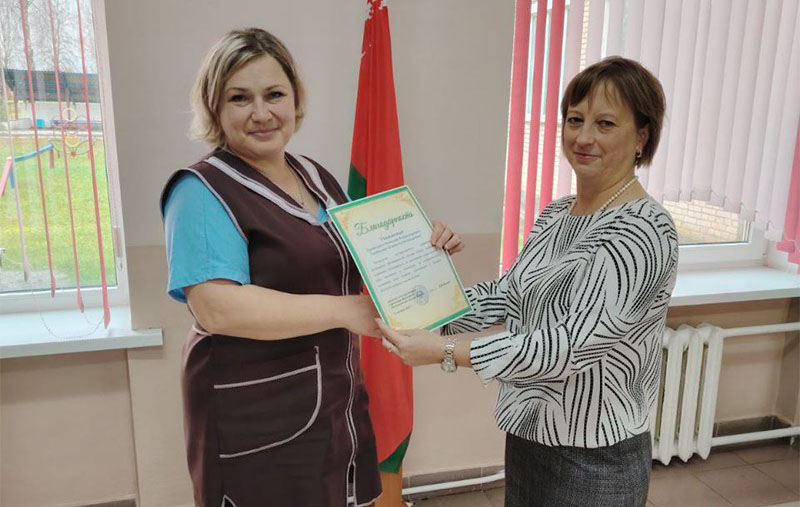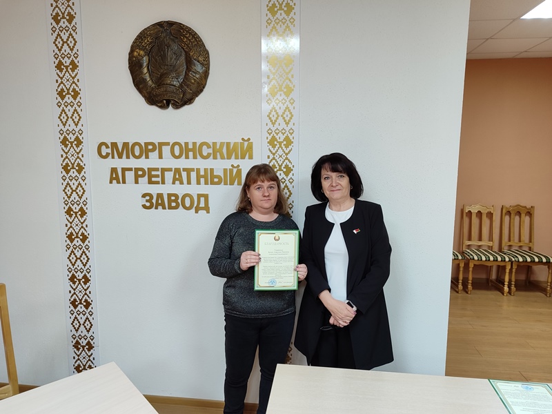 Главный специалист по идеологической работе и председатель профсоюзного комитета КСУП «Совбел 2016» Наталия Буйновская организовала торжественную церемонию прямо в коллективе предприятия. Перед лицом своих коллег благодарственное письмо и цветы были вручены главному экономисту Елене Нестер.