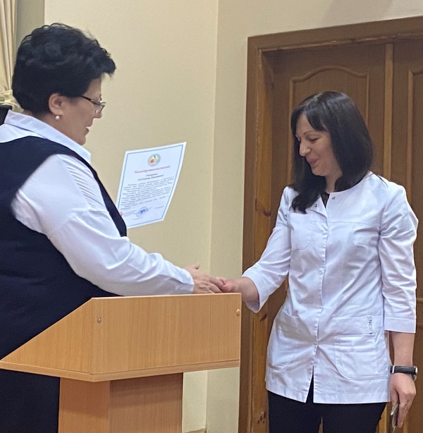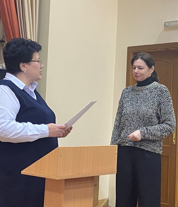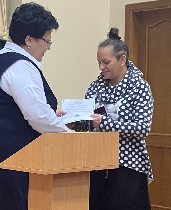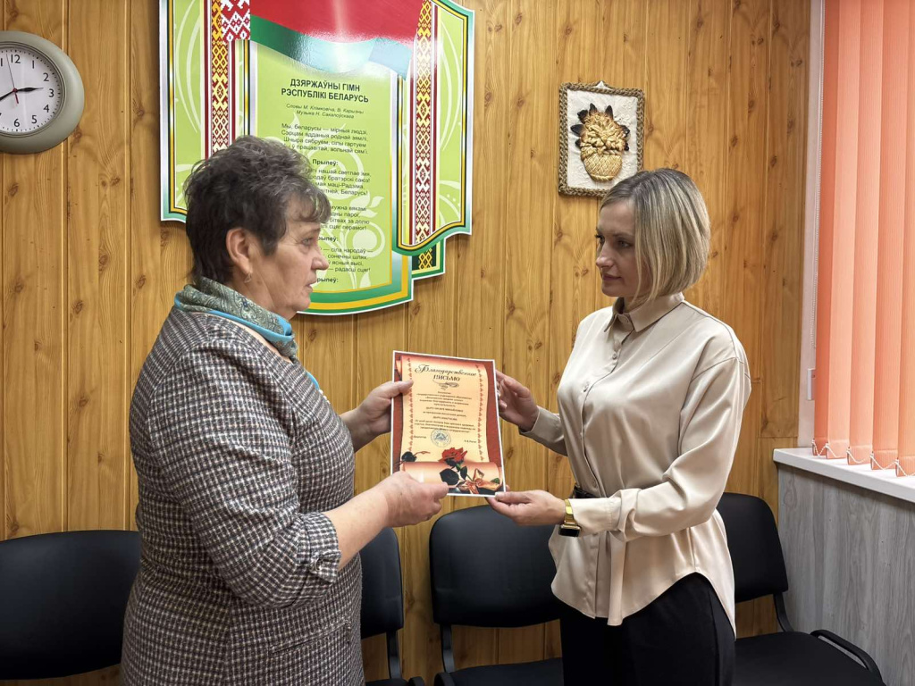 Еще одно вручение прошло в стенах Вишневского Дома культуры. Его заведующая, Альфреда Дыро, вручила благодарственное письмо специалисту своего учреждения Оксане Дыро. Это событие подчеркивает преемственность поколений и важность семейных традиций.