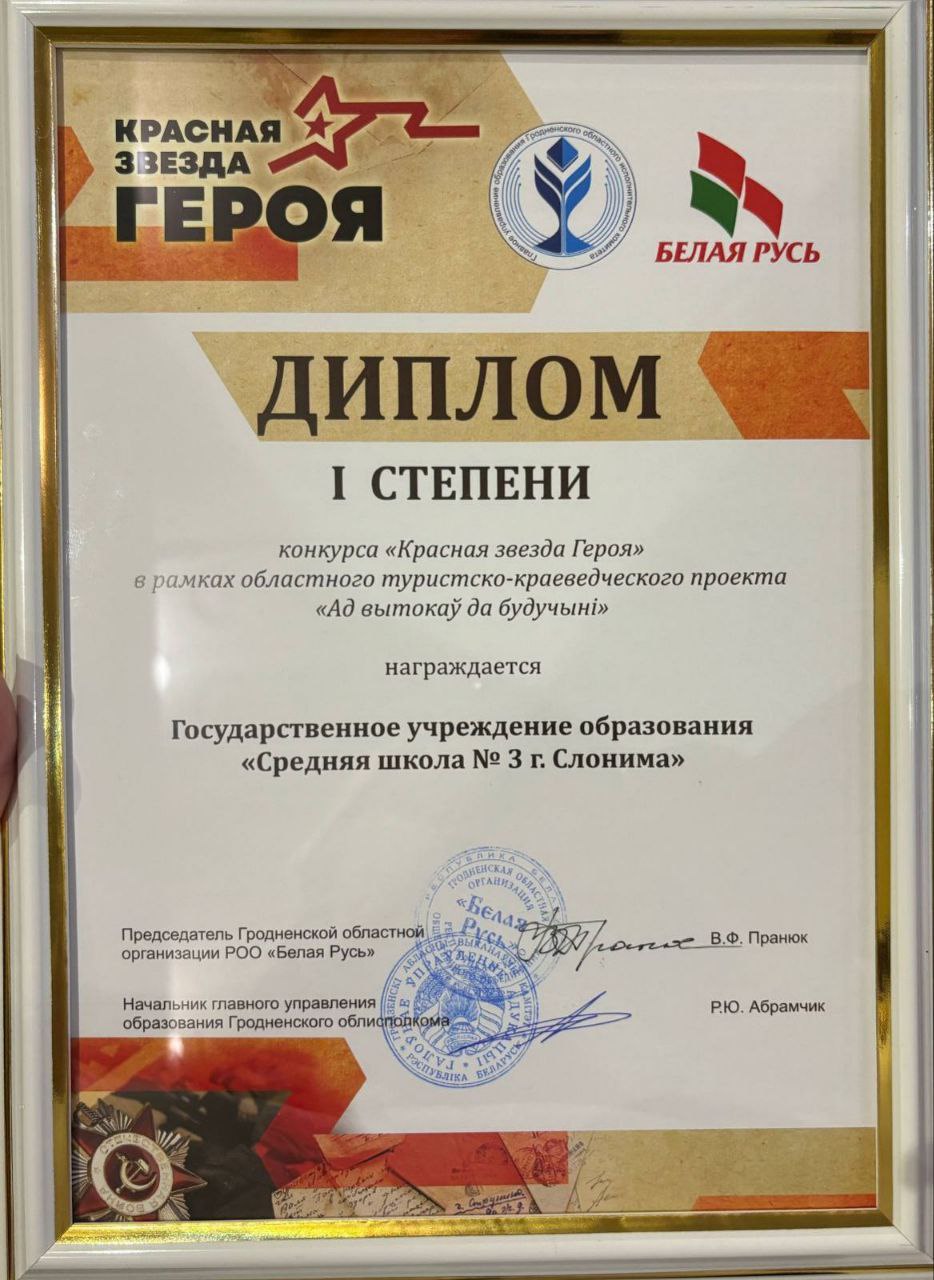 В патриотическом проекте «Красная звезда Героя», инициированном областной организацией республиканского общественного объединения «Белая Русь» совместно с главным управлением образования Гродненского областного исполнительного комитета по случаю 80-летия Великой Победы и Года благоустройства, лучшей были признана команда государственного учреждения образования «Средняя школа № 3 г.Слонима».