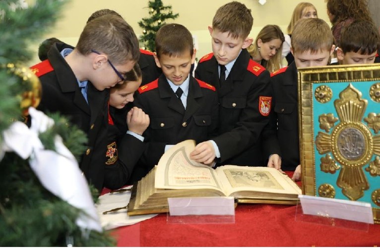 У Рождественской елки была организована выставка Евангелия напрестольного. Ученики с интересом рассматривали массивные издания в благолепно украшенных обложках с металлическими накладками и священными изображениями.