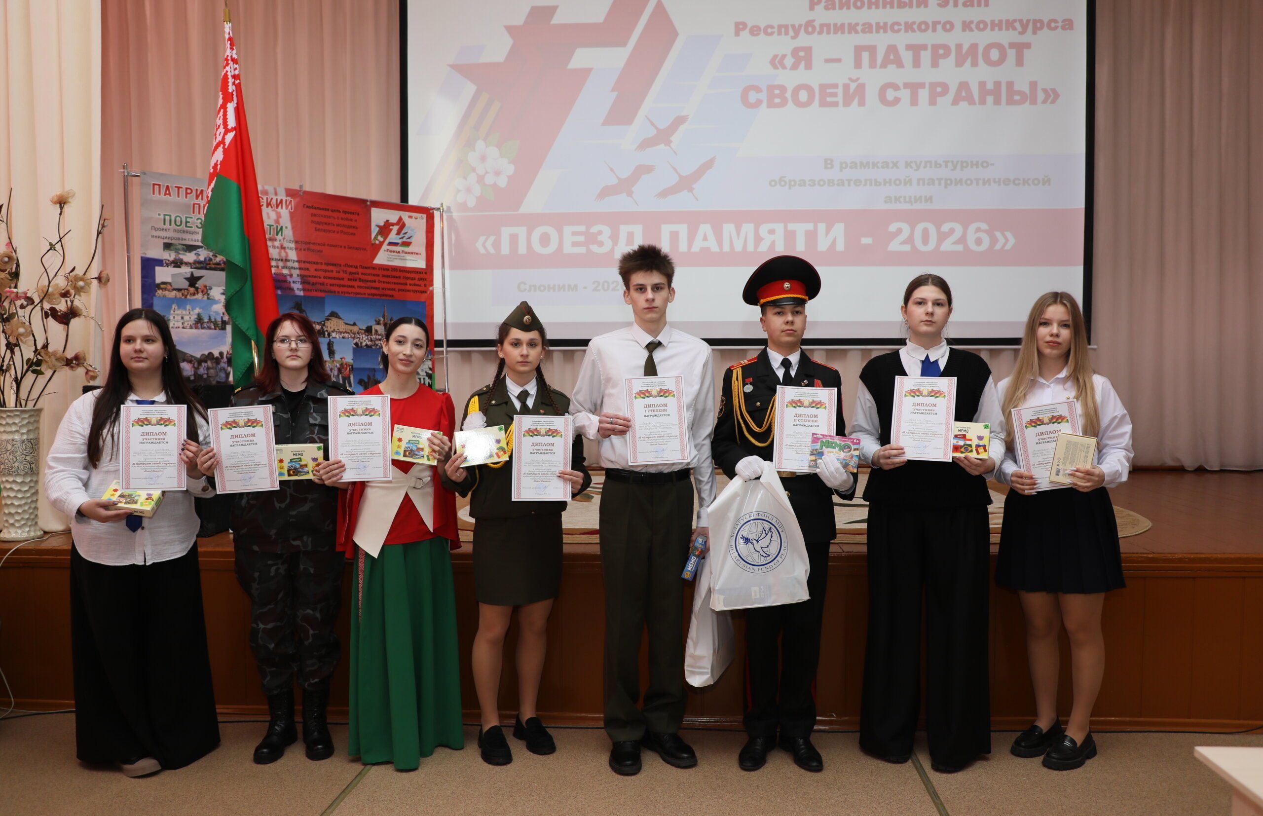 Как Слонимщина выбирает тех, кто может побороться за возможность стать пассажиром «Поезда Памяти»? Конечно, через конкурс «Я патриот своей страны», районный этап которого состоялся 27 февраля 2026 г. Участие в конкурсе приняли 9 ребят-десятиклассников.