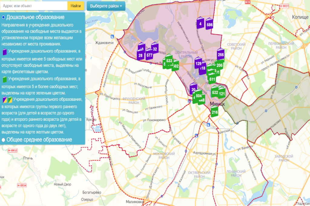 Воспользоваться картой легко: наведите курсор на значок сада, во всплывающем окне – наличие свободных мест, полное название учреждения и контакты.