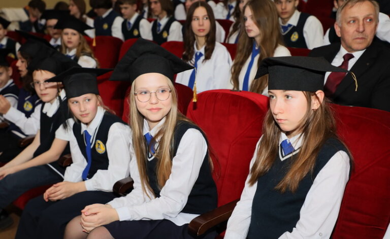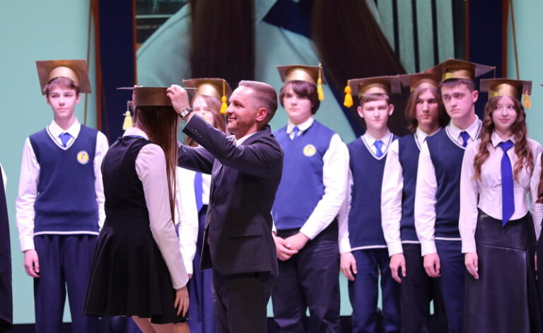 Для 38 одиннадцатиклассников гимназии этот день стал важным рубежом – они надели золотые шапочки, тем самым официально подтвердили звание выпускников. Церемонию посвящения провели директор гимназии Денис Викторович Криштопчик и клирик Свято-Троицкого собора иерей Николай Савицкий.