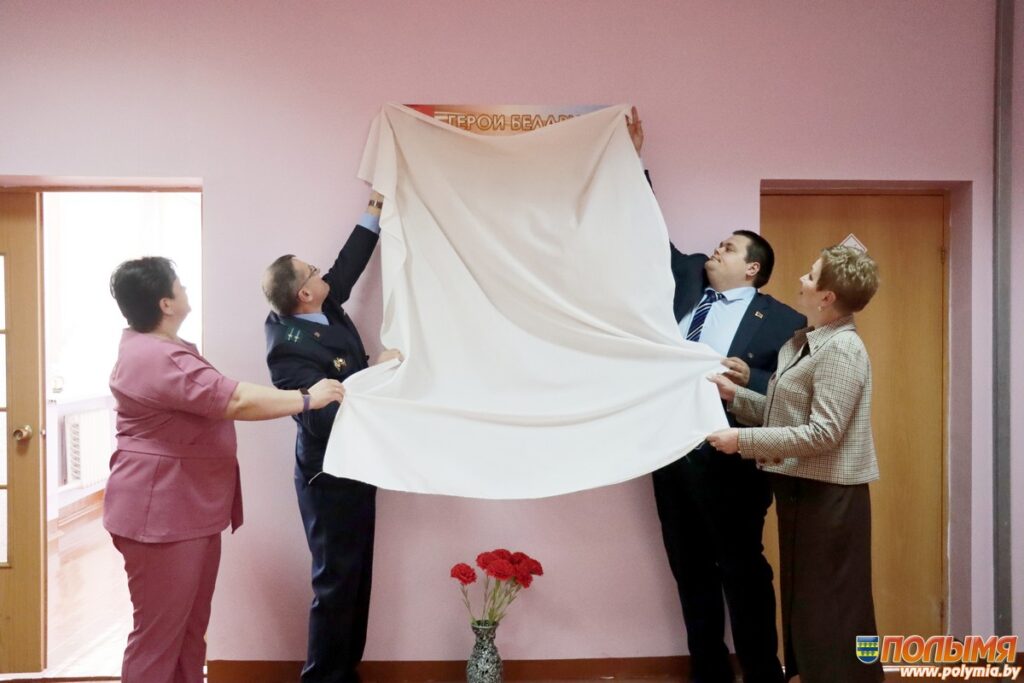 После открытия выставки присутствующие отправились на еще одно немаловажное мероприятие — открытие стенда «Герои Беларуси», которая расположилась в фойе у актового зала.